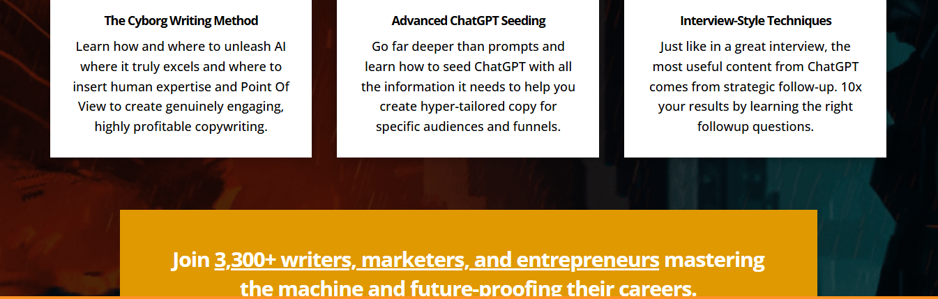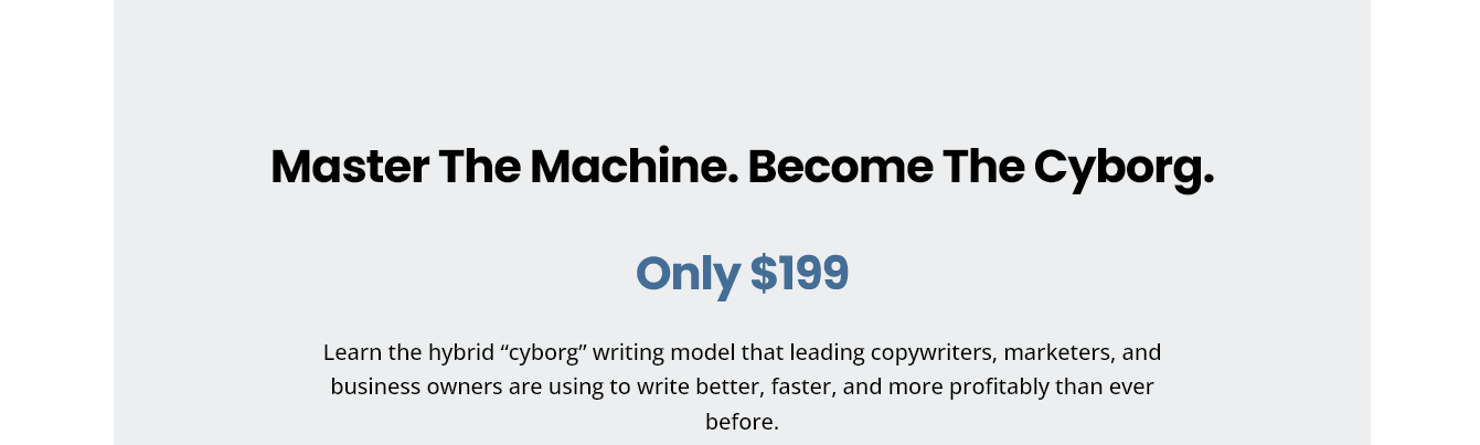 Learn the hybrid “cyborg” writing model that leading copywriters, marketers, and entrepreneurs are using to write better, faster, and more profitably than ever before.