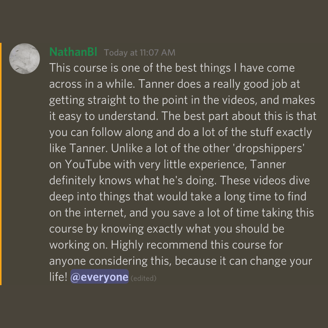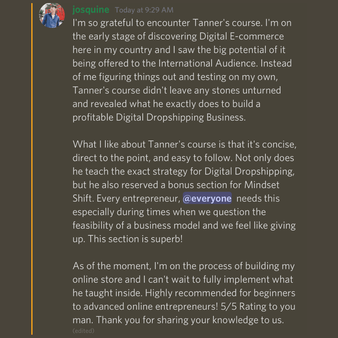 "Tanner is on point with everything. He's been an early market mover in the dropshipping space for several years. I recommend getting into Digital Dropshipping with this course!"- Obie Hallum