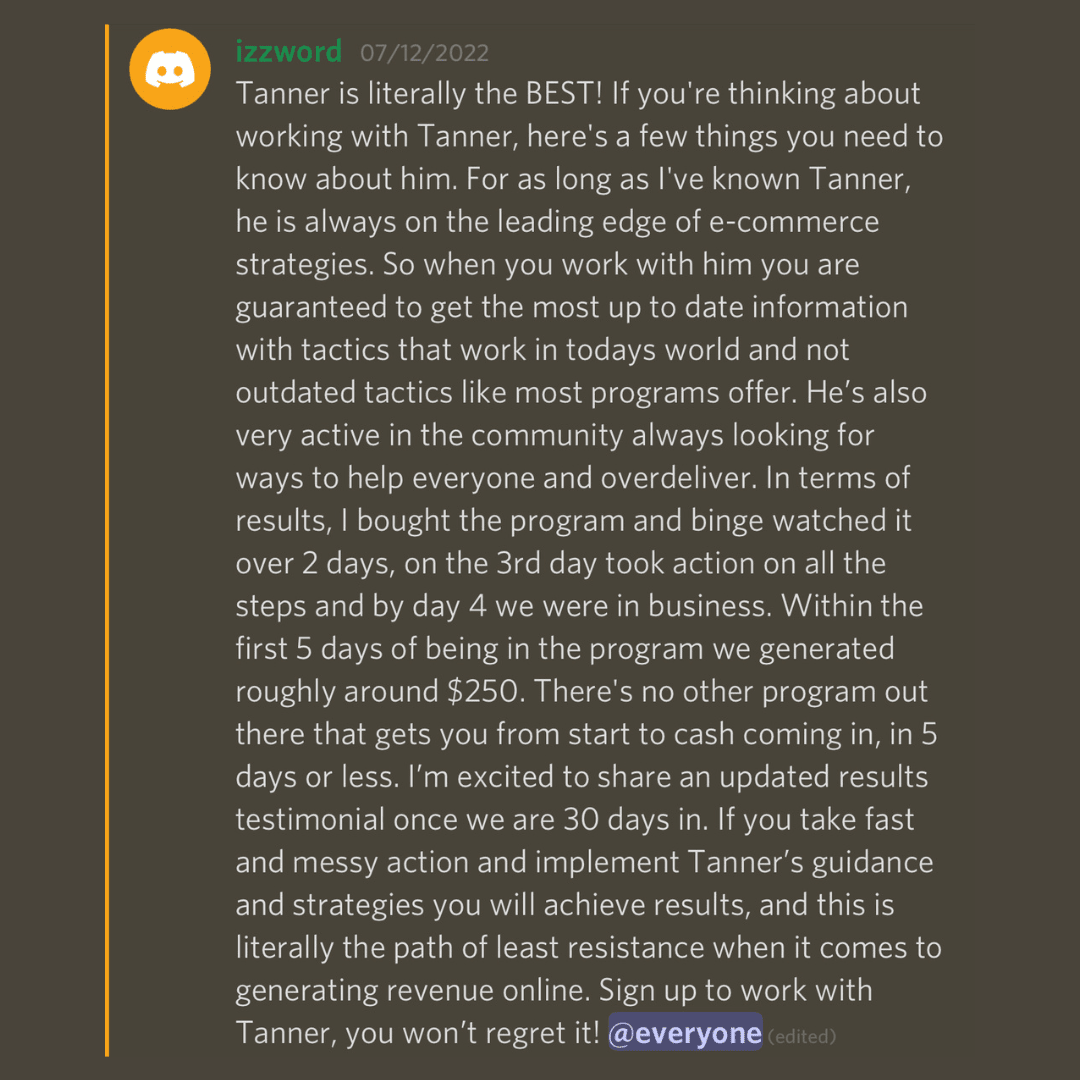 "There are so many course sellers who do it just for the money and leave you hanging once you sign up. But Tanner is super invested. Not just in creating the best, up-to-date content. But also making sure that his students and community are actually getting success."- Isabella Bedoya