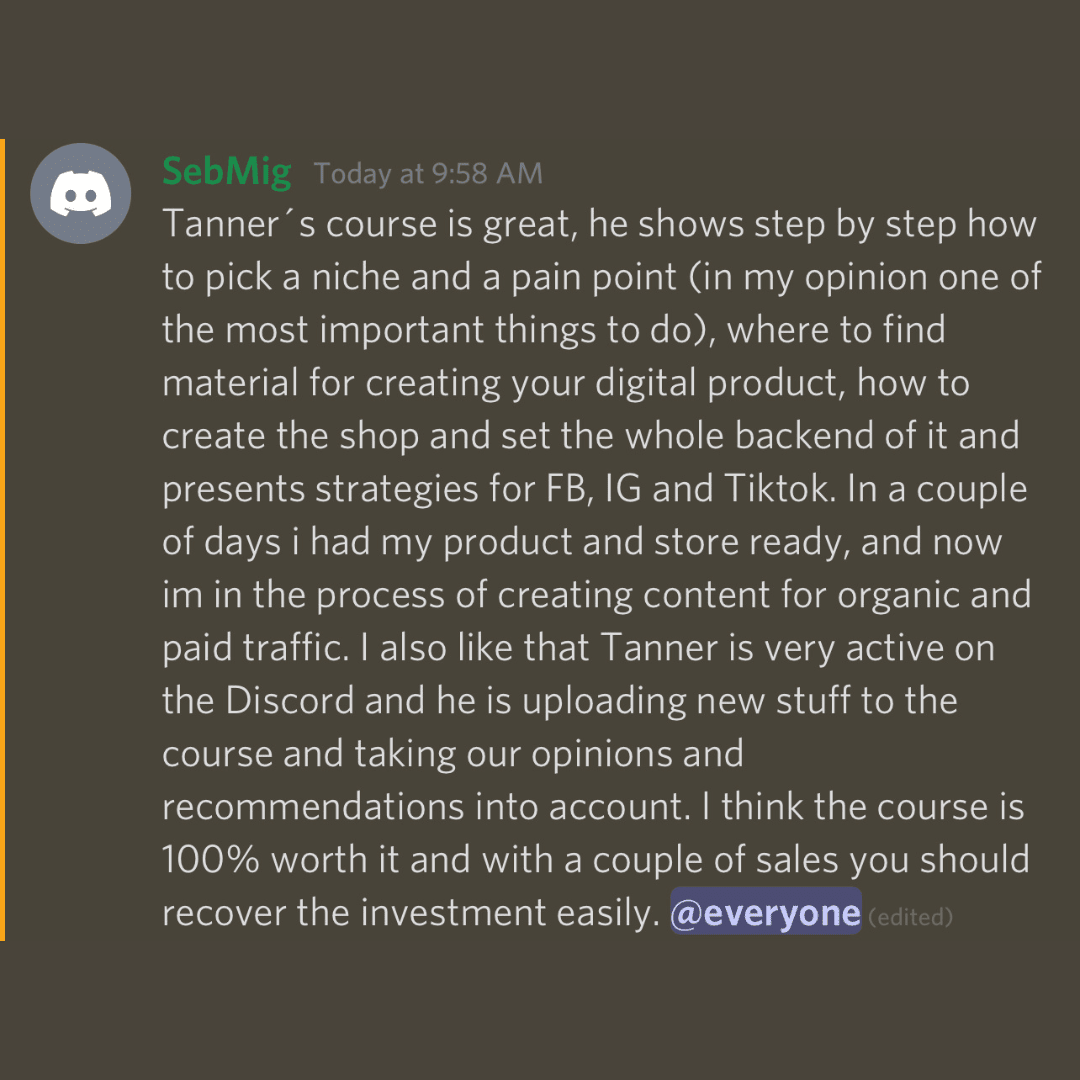 "Before working with Tanner, I never sold any digital products. I've been in this for the past four months and I've sold more than $150k. Just in the last month, we did $60k! This is the real deal."- Sebastian M.